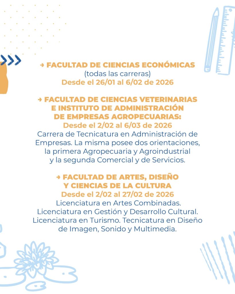 - Ciencias Veterinarias – Tecnicatura en Administración de Empresas Agropecuarias: del 2 de febrero al 6 de marzo